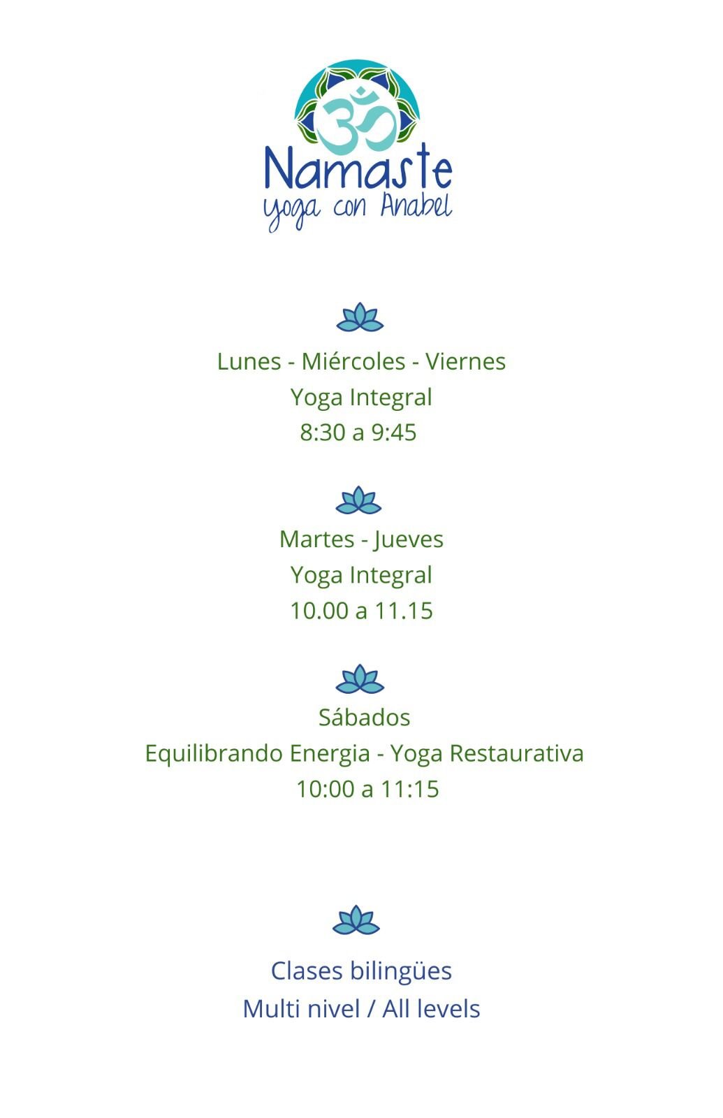 Namaste Yoga with Anabel offers an integrated practice where each session focuses on strengthening, stretching, and relaxing the body, quieting the mind, calming the nervous system, and connecting with the heart… leaving you feeling more centered, energized, and at peace. Anabel is completely bilingual and welcomes all levels.